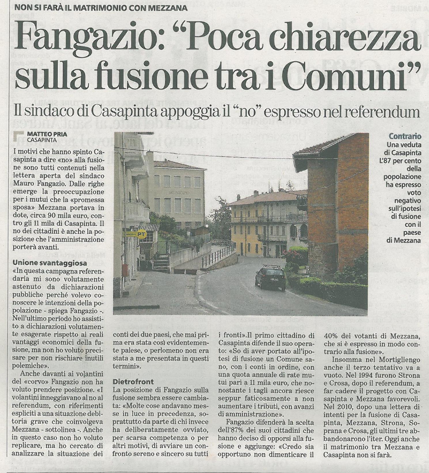 | La Stampa 17/06/2015: Il Sindaco appoggia il NO espresso nel referendum per la fusione |